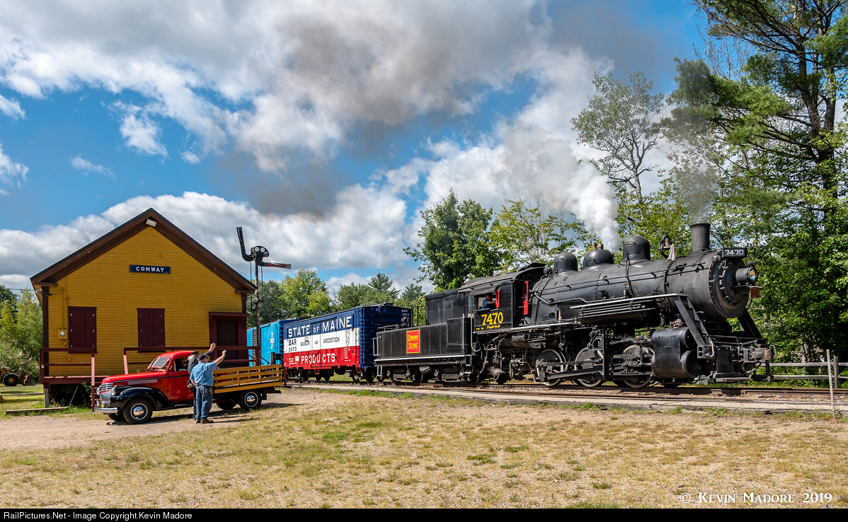 Westbound out of Conway. After loading logs, stone and boxed goods, Conway Scenic Railroad's Canadian National 0-6-0 departs the Conway Yard with a branch line freight, bound for North Conway and points west. The old freight house pictured here dates to the early 1870s and was likely built by the Portsmouth, Great Falls & Conway Railroad as their line was extended north to North Conway. This line was eventually absorbed into the Boston & Maine system as their Conway Branch. The line was finally abandoned by the B&M in 1972, and within a couple of years was purchased by the newly-formed Conway Scenic Railroad, which operates tourist excursions there today. The event seen here was part of the Conway Scenic's Railfan Weekend, in which special trains, like this freight, were operated in addition to the normal tourist runs to Conway, Bartlett, and Crawford Notch.