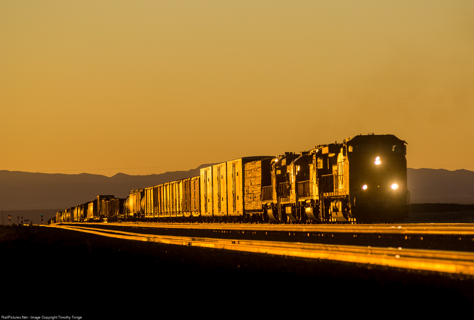| ATSF 762 leads an eastbound merchandise train at West Sais, NM, moments before sunset. April 1, 2005. |