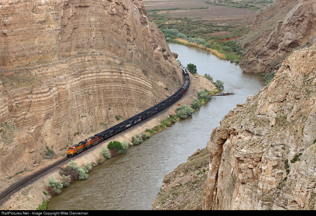 A southbound BNSF manifest freight curves along the Bighorn River as it enters Sheep Canyon and its sheer cliffs north of Greybull, Wyoming, on June 23, 2019.