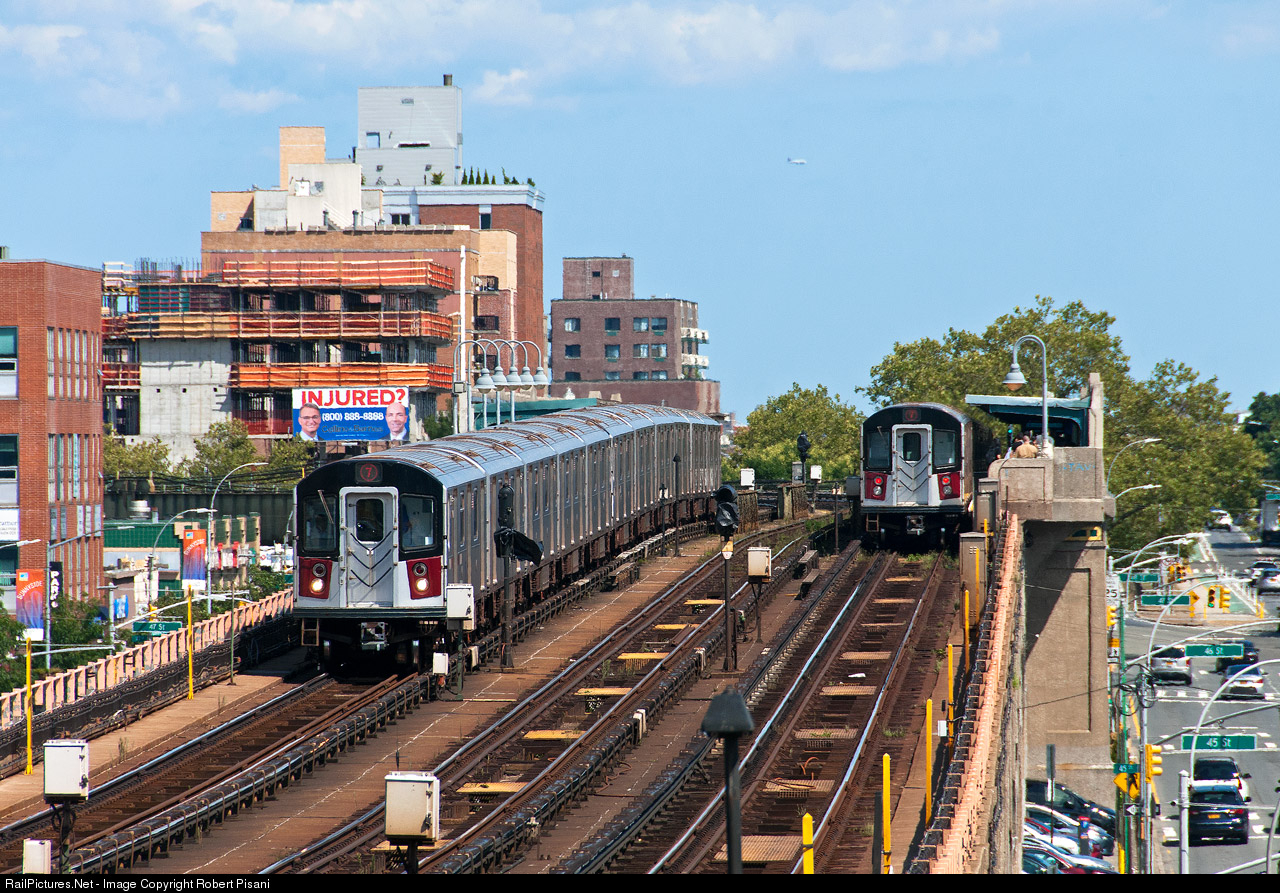 7 Trains meet at the 46th St-Bliss St Station along Queens Blvd in Queens, NY. In the distance, an airliner climbs shortly after takeoff from LaGuardia Airport.