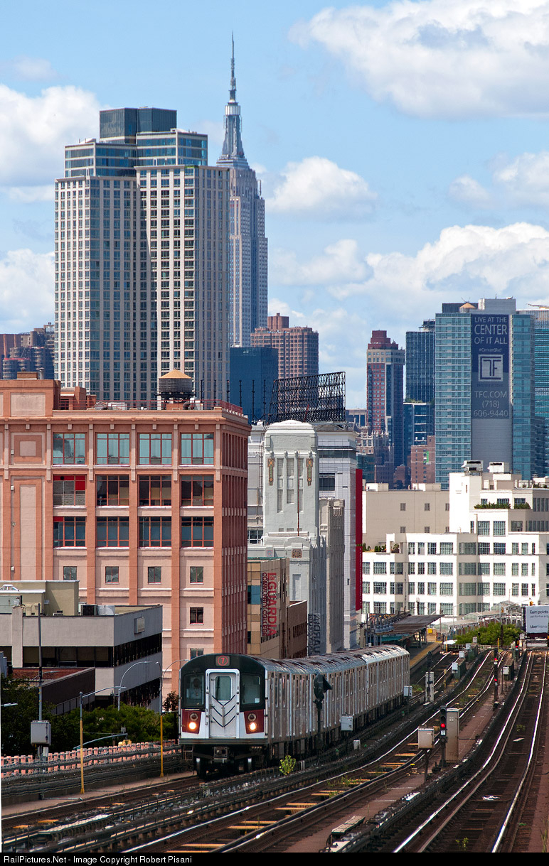 An outbound 7 Train leaves Manhattan behind while running above Queens Boulevard in Sunnyside. The Empire State Building used to be mostly visible from this angle but development in Queens has altered the view.