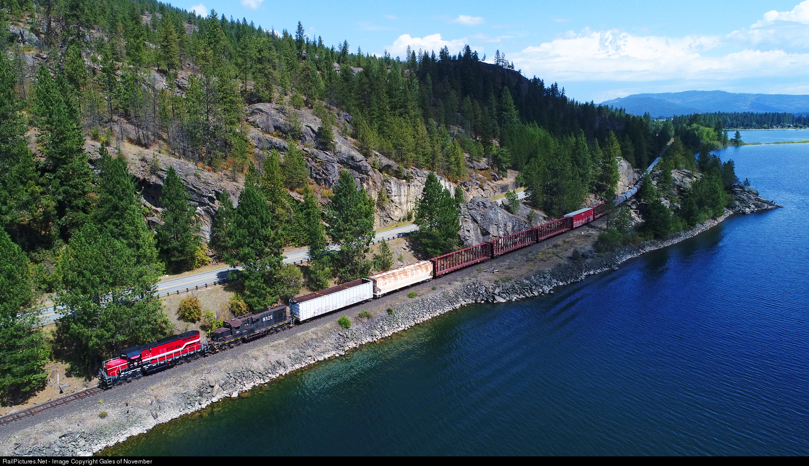 The POVA is an amazingly scenic railroad... from a boat. While the railroad skirts the beautiful Pend Oreille River for a large portion of its trip, most of it cannot be viewed or appreciated from the road. The air is truly the best way to see this cool little railroad! Seen here after interchanging with the BNSF at Sandpoint, they narrowly beat a cloud to this spot!
