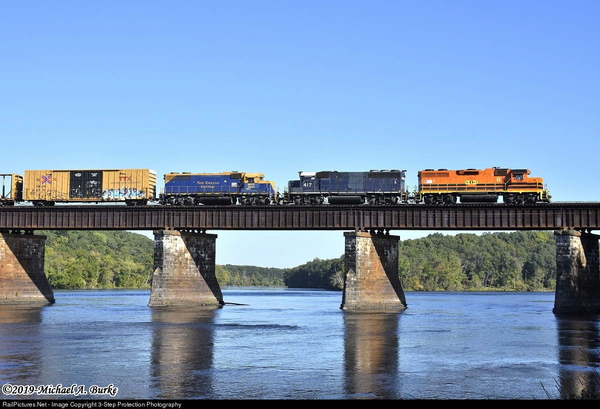 Three variations of New England Central EMD 4-axle road switcher locomotives, which consist of a GP38-2, GP40-2 and a GP38, head CSO-4 (Hartford, CT - West Sprinfield, MA) across the Connecticut River in Enfield.