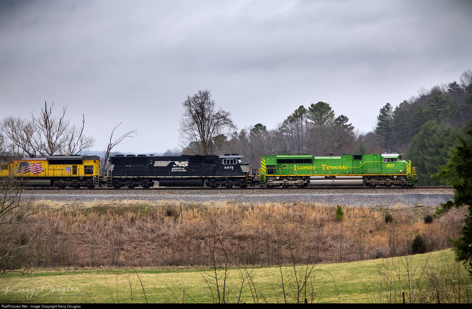 | There’s two side to a typical winter in the south. Blistering cold and sunny or warm and dreary. On this warm January morning, NS 64G with the Illinois Terminal Heritage Unit as the lead motor is easing the loaded key train down Howardsville grade on the outskirts of the town of Cohutta, GA. With it being a slow morning on the NS Atlanta North-End the unit train is lined up to Varnell, GA just north of Dalton waiting for CSX to clear up and give NS a light to cross the diamond in downtown Dalton. Photo from the John Kirk collection |