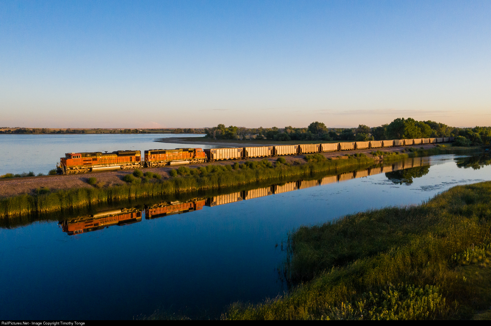 | BNSF 8485 leads a eastbound coal load at Barr, CO, moments ahead of sunset. Barr Lake is seen behind the train. Sept 13, 2019. |