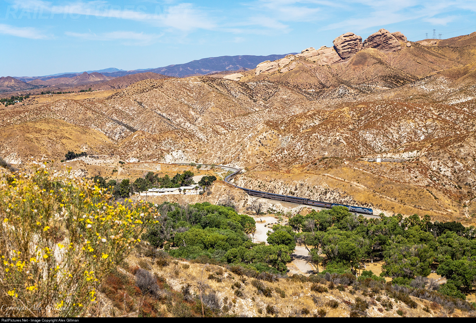 | Amtrak's detouring northbound Coast Starlight twists and turns between Russ and Ravenna as the long distance train climbs through the ex-Southern Pacific Soledad Canyon. Part of the original North-South rail connection that linked California together in September of 1876, Ravenna consisted of a small station and water spigot that would quenched the thirst of steam locomotives working through treacherous canyon. It also served as a shipping point for Yucca Dranconis, a type of cactus used at the time for creating a superior grade of bank note paper. |