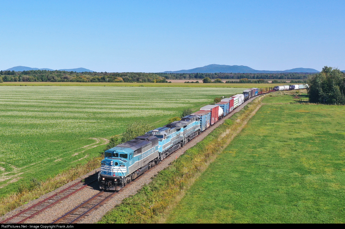 Central Maine & Quebec 9023 North as it rolls through the rural farmland of Eastern Townships of Quebec.