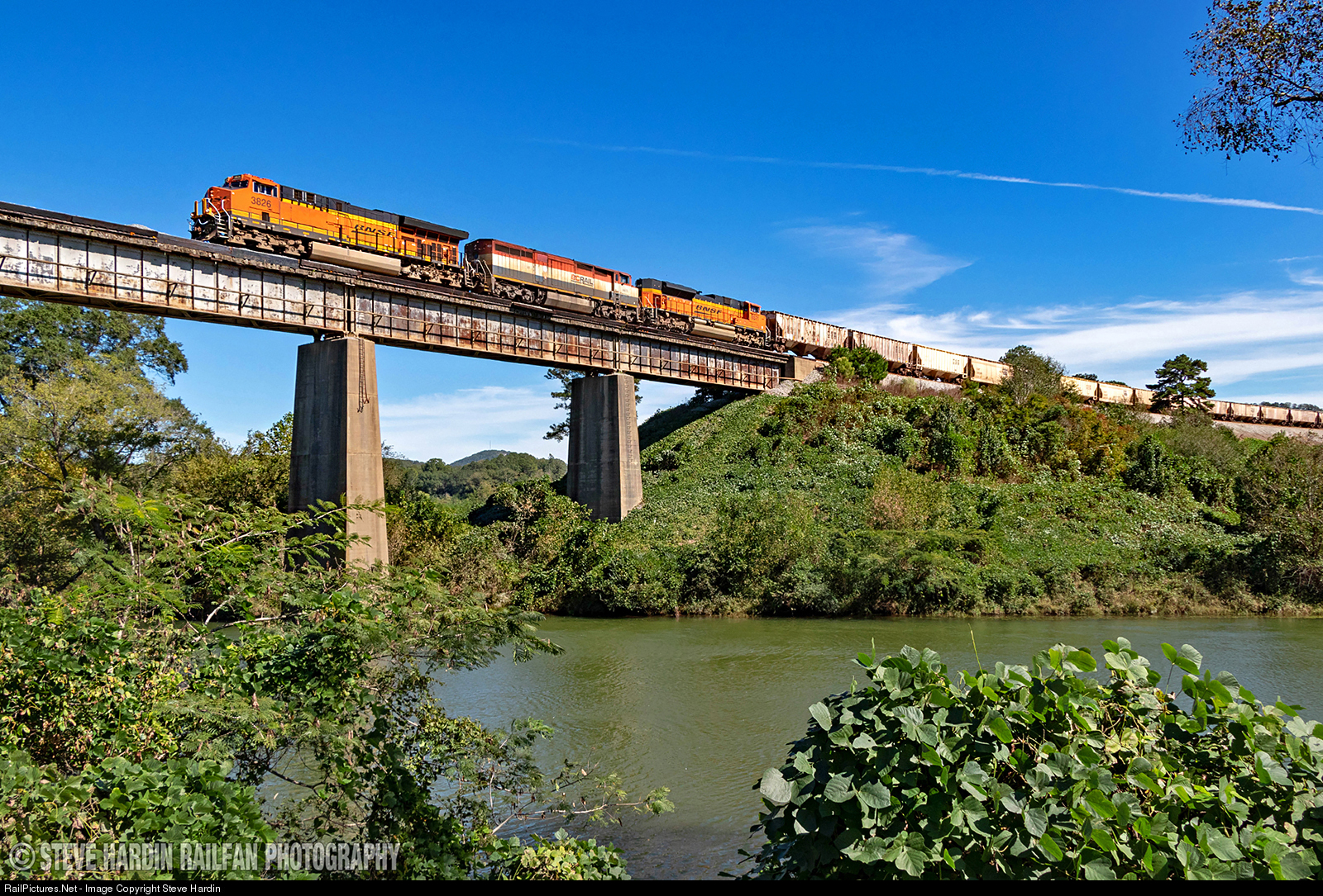 The Chicago bound loaded phosphate train glides over the Etowah River with a BC Rail unit sandwiched between a pair of BNSF.