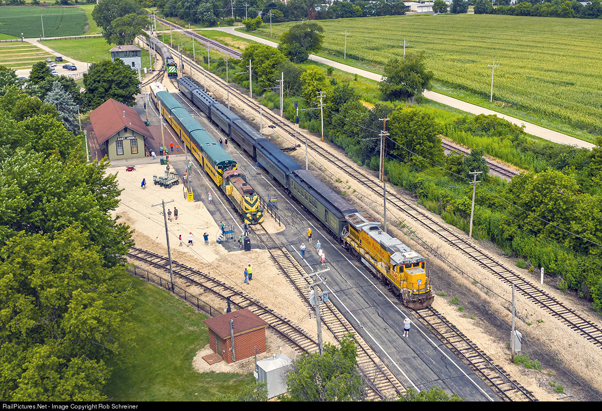 The CN&W 1689 is set to lead the bi-level train, with the BN 3 (EMD E9AM) on the rear to provide HEP, on station track one. On station two, the UP 1848 (GE B40-8) is set to lead the coach train, behind that, the BN 5383 (GE U30C) is ready to come into station 2 with the Nebraska Zephyr in tow.