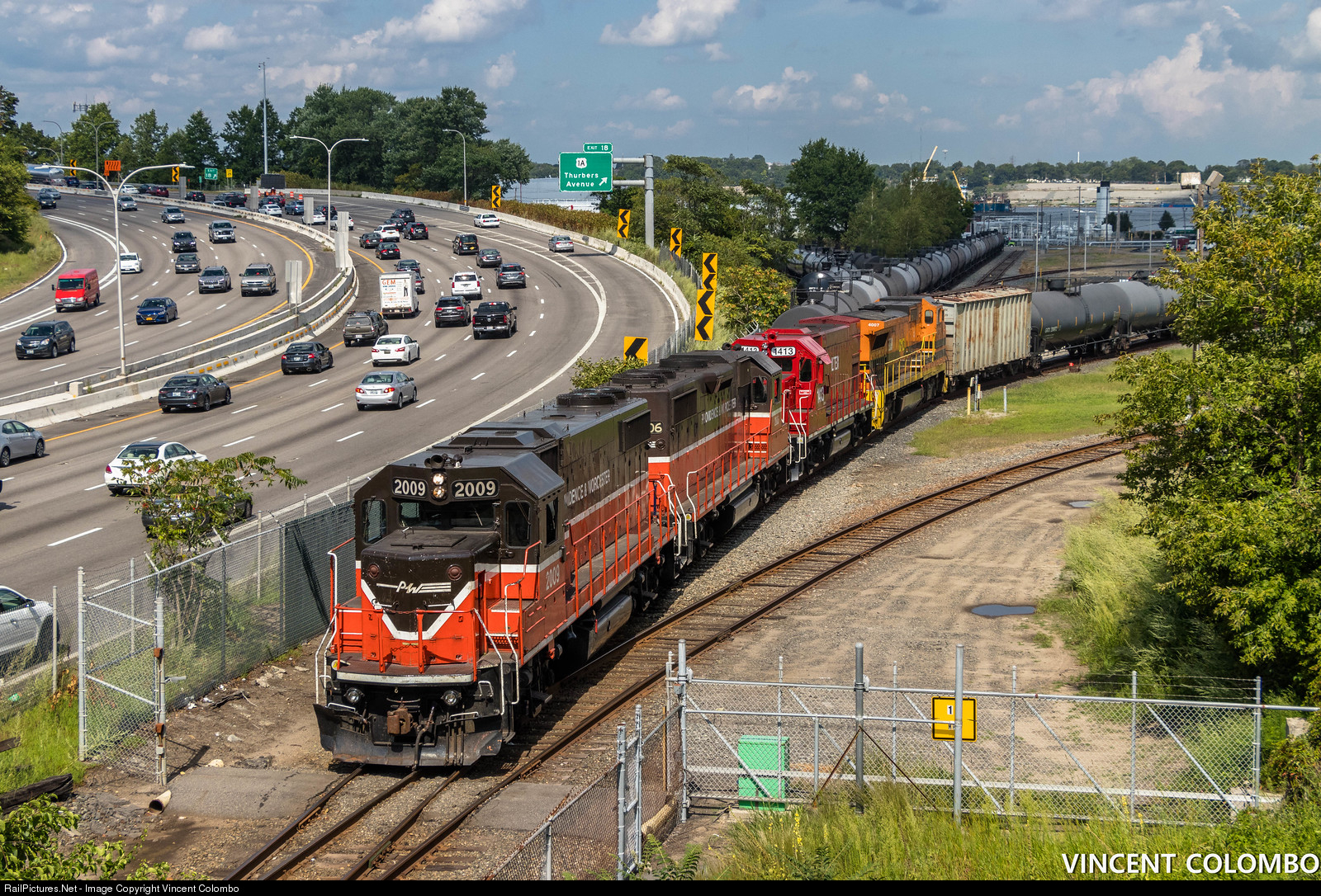 | Providence and Worcester PR-3, an ethanol train from Worcester, has arrived its destination at Motiva in Providence. WX-1 handed the train off to PR-3 at Pawtucket. PW 2009 (GP38-2) is leading the train that originally started out in Montreal. |