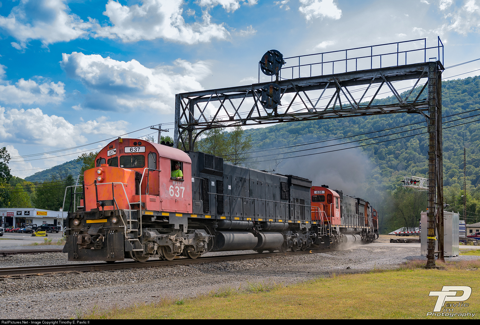 The Western New York & Pennsylvania's Driftwood turn roars across Allegheny Avenue in Emporium, Pennsylvania on the afternoon of September 11, 2019, in a cloud of dust and signature ALCo/MLW smoke. Immediately north of the crossing stands one of three decommissioned PRR signal bridges on this part of the former NS Buffalo Line (the others stand at Driftwood and North Eldred).