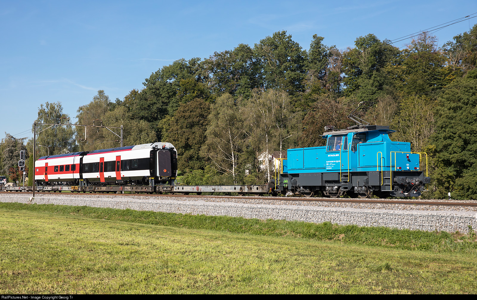 | The dual power electro/battery locomotive Eea 936 # 131 of StadlerRail is pulling four lowfloor cars with two carbodies of a "Giruno" highspeed train of the RABe 501 series for the SBB. The carbodies for the Giruno are built in Bussnang and then transported to Erlen, for mounting on the bogies, assembling and testing in the commissioning centre. |