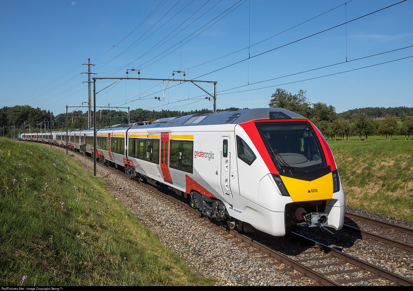 | "Flirt" electric multiple unit class 745/0 # 008, built by StadlerRail for the british Abellio Greater Anglia, for service between London Liverpool Street station and Norwich under the East Anglia franchise. There are 10 of this trains ordered, and 10 similar for the Stansted Express from London to Stansted Airport. The train is pulled by locomotive Eea 936 # 131 of StadlerRail from Romanshorn Süd to Rekingen AG for temporary storage. |