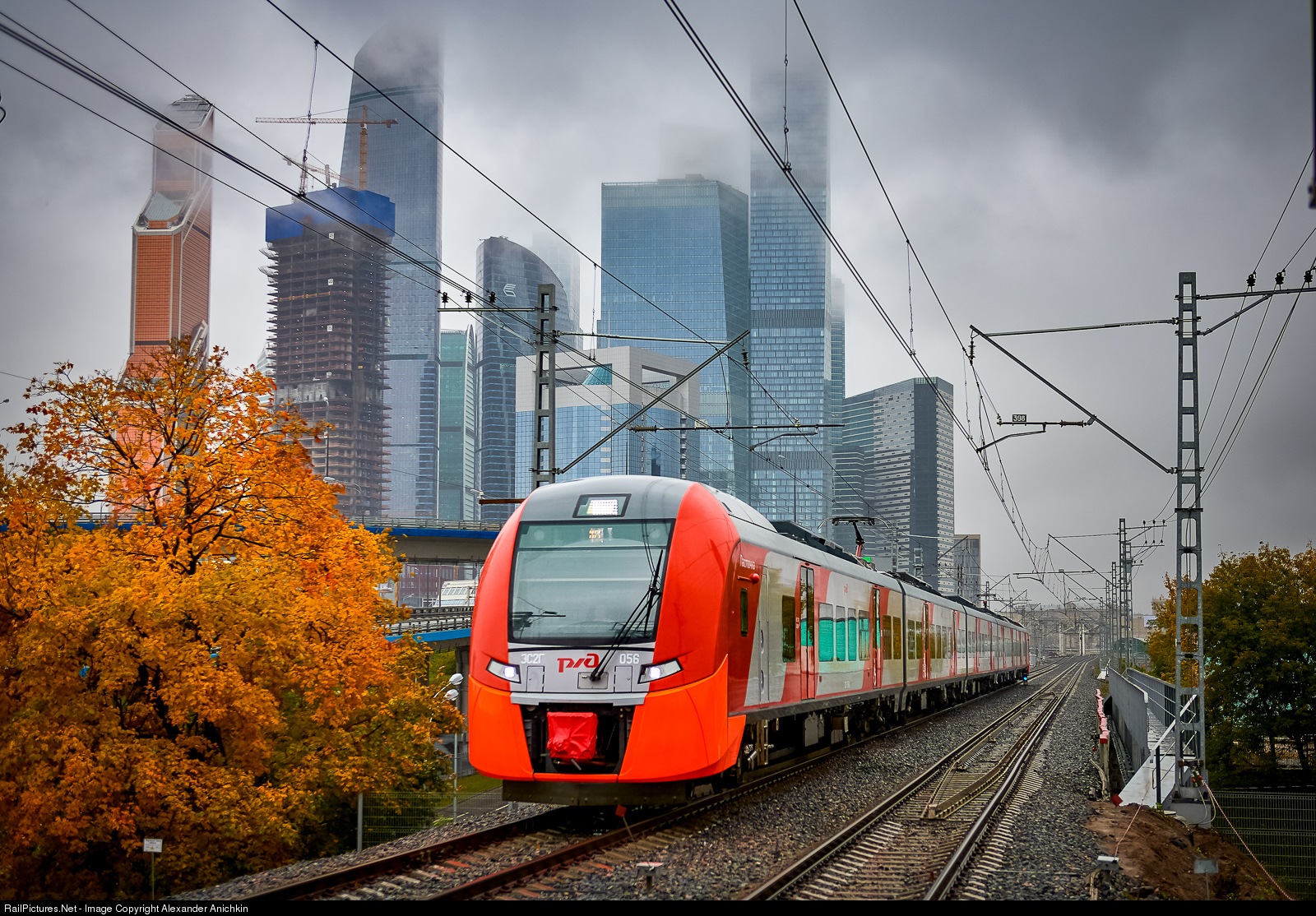 ES2G-056 DC commuter train runs under October rain on the Moscow Centrain Circuit (MCC) which was opened for passenger traffic just a month before. MCC is a major infrastructure project to improve public transportation system in Moscow.