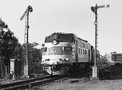 Bound from South Station to Needham Heights, MA, with an evening rush hours train, the class unit of the MBTA's FP-10s splits the manual block semaphores at the junction at Forest Hills where Needham Branch trains diverge from the mainline.