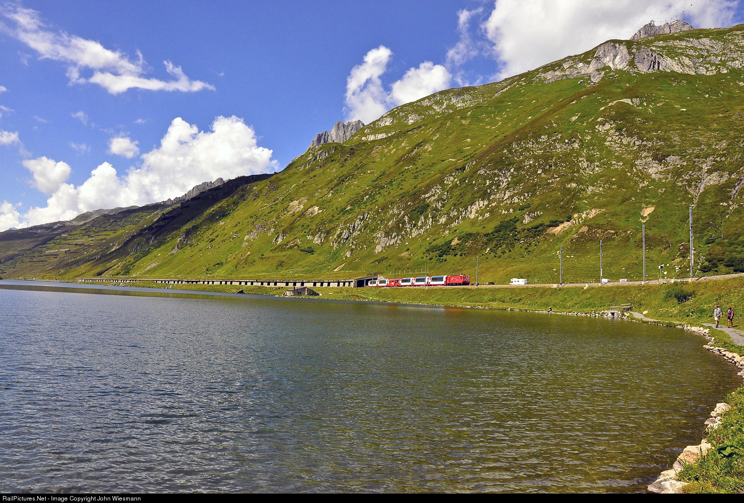 | Bright morning sun illuminates the pass of Oberalp. HGe 4/4II with a short glacier express after leaving the gallery tunnel at summit of the pass. This gallery and the snow sheds are especially necessary in winter time, when heavy snow falls can cause avalanches in this area. |