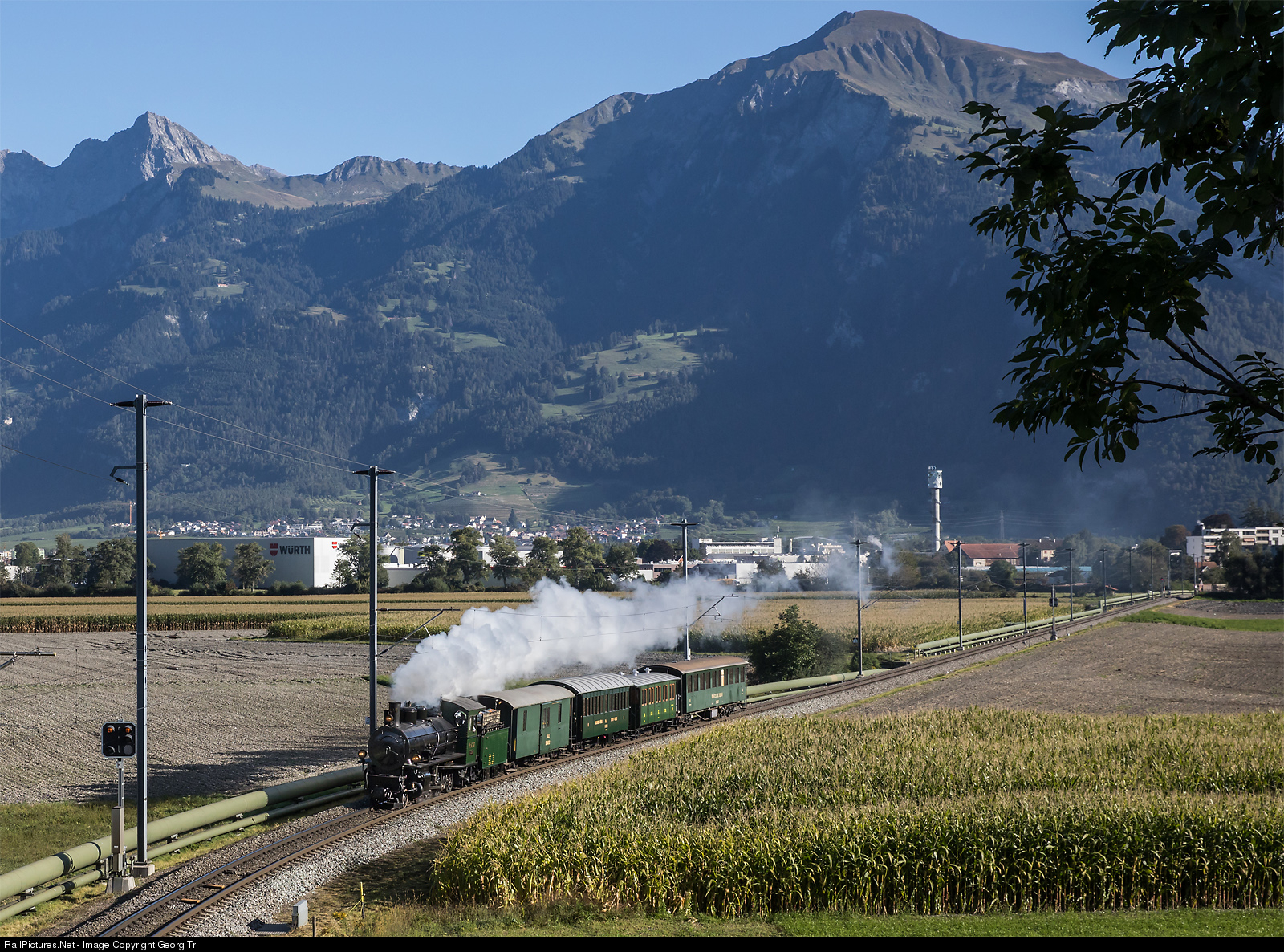 "Consolidation" 2-8-0 G 4/5 # 107 "Albula" of the Rhaetian Railway, built in 1906 by the SLM Winterthur, is pulling a transfer train from Landquart to Disentis, between Igis and Zizers Altlöser, with the Glegghorn and Vilan in the background.
