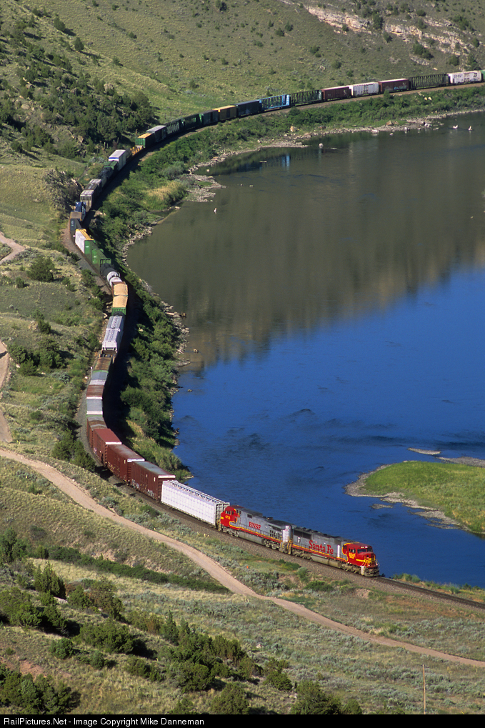 A pair of colorful warbonnets power a westbound Burlington Northern Santa Fe freight through Lombard Canyon east of Toston, Montana, on July 1, 2001. Leading the train is former Santa Fe EMD SD75M No. 8247 and BNSF GE C44-9W No. 4718.