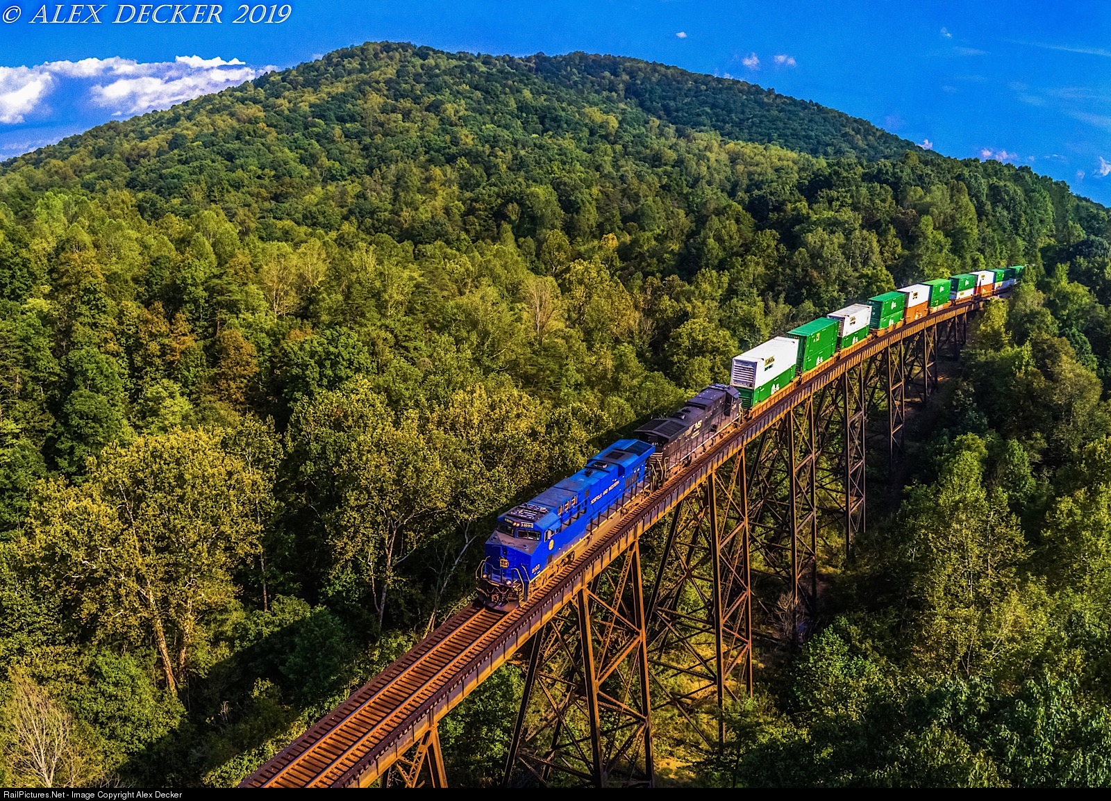 As the leaves start to change as fall slowly creeps in, 217 makes a run over Kate’s Creek with the Norfolk and Western heritage unit on the point.