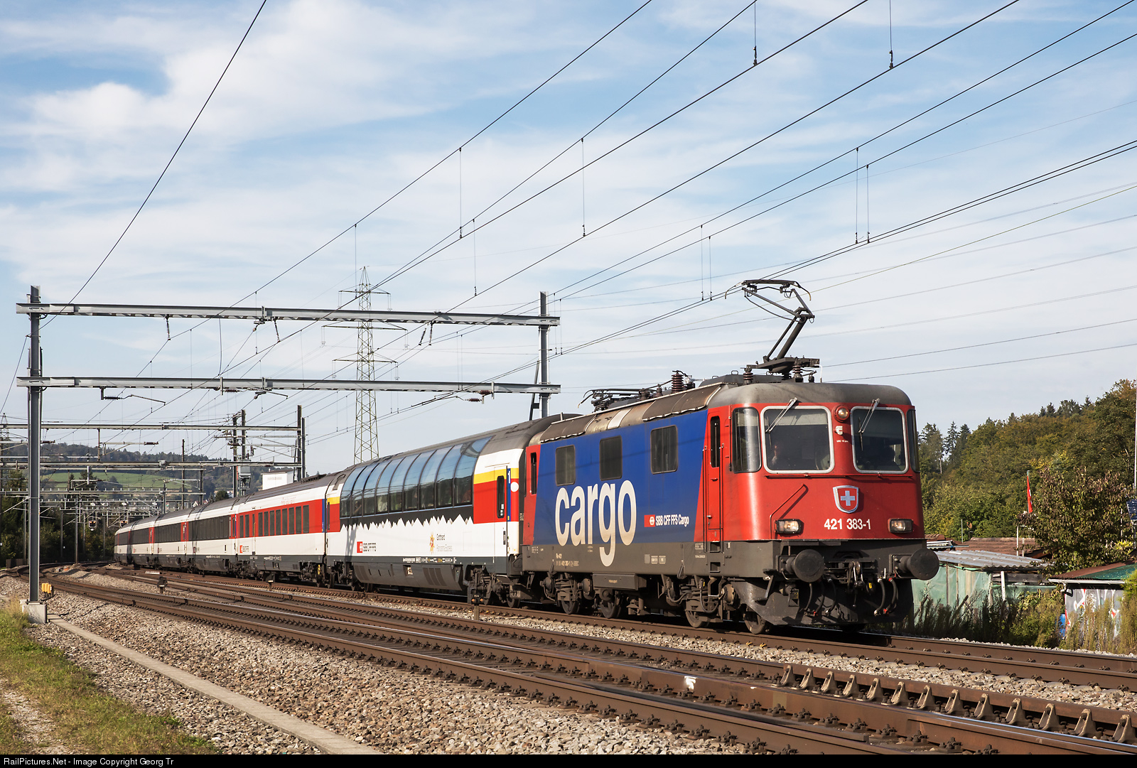 | Re 421 # 383 is pulling the Eurocity EC 194 from Munich via Lindau-Bregenz-St.Gallen to Zürich in Winterthur Tössmühle. This Eurocities are pulled by diesel locomotives of the Deutsche Bahn between Munich and Lindau and by electric Re 421 series of the SBB between Lindau and Zürich and vice versa. Behind the locomotive an Apm panorama car in the Gotthard Panorama Express (GoPex) paint scheme, which got all of this cars. Second car is a WRm dining car. The other cars of the train are Apm and Bpm of the SBB. |