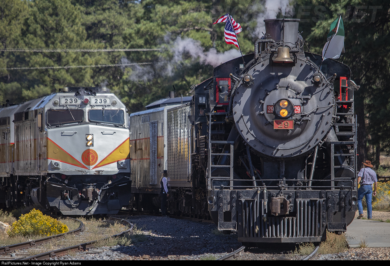 Peek-a-boo, the second train of the day has just arrived to the South Rim of the Grand Canyon. Meanwhile, the two stars of the show sit at the head end of thier train waiting on their depature time. Also just out of frame is a 5 car BNSF office car consists.
