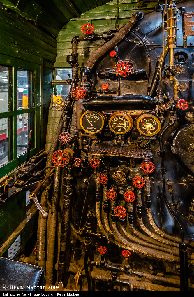DM&IR 2-8-8-4 "Yellowstone" Fireman's Station. Here's a detailed view of the Fireman's Station on board DM&IR #227, a massive 2-8-8-4 Yellowstone Locomotive, located in the main exhibit hall of the Lake Superior Railroad Museum in Duluth, MN. Behold the very crowded panel of valves and gauges, befitting a locomotive of this size and complexity. From here, the Fireman controls the Elesco Feedwater Heater, which uses exhaust steam to preheat the water from the tender, before it is pumped into the boiler. This reduces thermal stresses on the boiler, but also improves thermodynamic efficiency. The water level in the boiler is monitored via the water glass at the upper right. The Fireman also controls the stoker, and associated steam jets, which pulls (and crushes) coal from the bunker behind him using an auger, and distributes it into the firebox. There's no hand-bombing this baby. The firebox is like a bowling alley. It's just way too large for a single human to keep up with. The Fireman may, periodically get up and check his fire, and perhaps use the coal scoop to cover any areas which are not getting proper coverage from the stoker, mainly the corners. The array of valves in front of him also includes the blower, which directs steam through the venturi in the smokebox, and is used to put a draft on the fire when the locomotive is not in motion. Needless to say, between his duties keeping steam pressure up and monitoring the water and fire, the Fireman on this engine is a busy puppy. Oh did I mention that he also needs to be watching the track on left-hand curves?