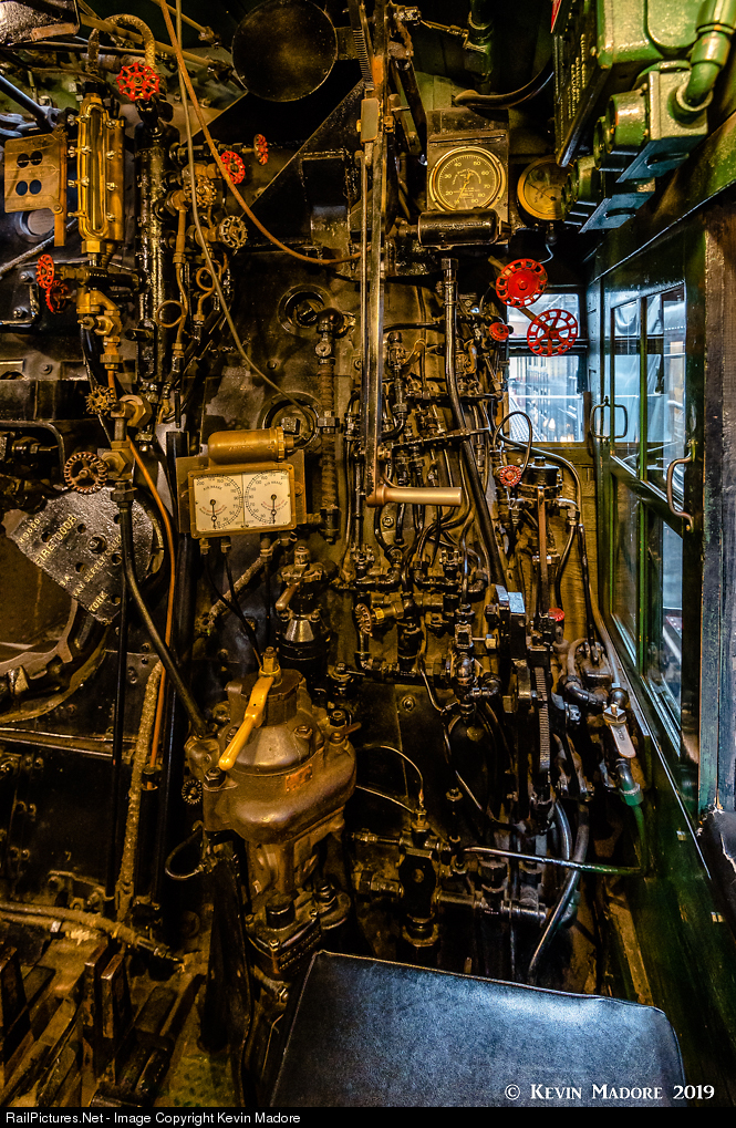 DM&IR 2-8-8-4 "Yellowstone" Engineer's Station. Here's a detailed view of the Engineer's Station on board DM&IR #227, a massive 2-8-8-4 Yellowstone Locomotive, located in the main exhibit hall of the Lake Superior Railroad Museum in Duluth, MN. Behold the very crowded panel of levers, valves and gauges, befitting a locomotive of this size and complexity. From here, the Engineer or "Engineman" operates this mighty beast. Directly in front of him is an overhead-type throttle. Below that, the power reverse. To the left are the train brakes and independent, along with the accompanying air gauges. Up at the top left, the Engineer has his own water glass. Water is so important that BOTH crew members actively watch it. Note the rather small front window in this cab. Quite honestly, the thing I most remember after my lengthy visit to this cab.....is just how little the Engineer and Fireman can see from their stations.