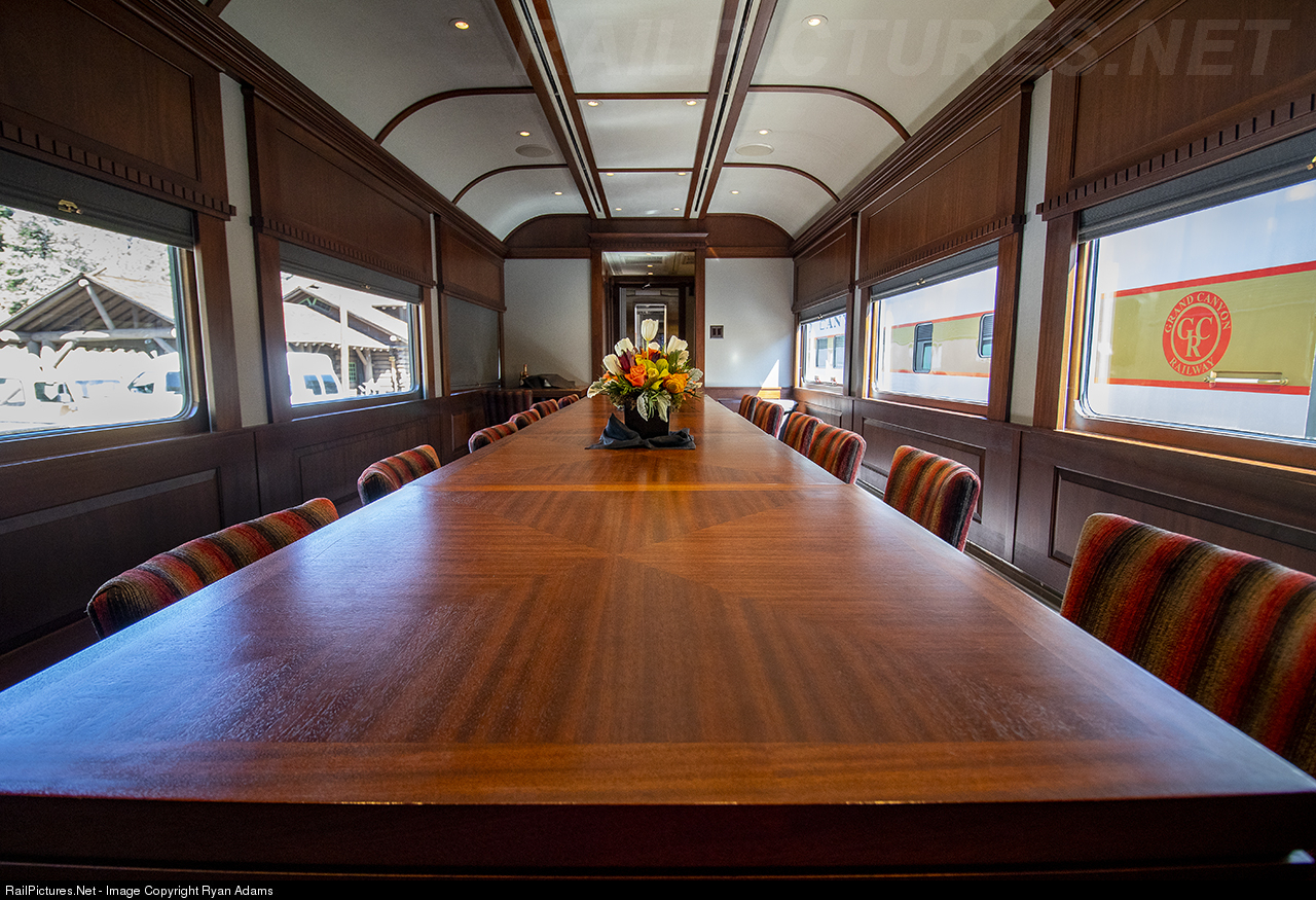 | The BNSF Railway Business Car #35 the "Canyon View". For the 100th anniversary of the Grand Canyon becoming a National Park and the 30th anniversary of the Grand Canyon Railway. BNSF brought a 5 car business car train to the South Rim of the canyon and opened a few cars up for tours. Pictured above is one of the mainly tables that is onboard this train. Located on the main floor of the Canyon View, this table has seen many visitors thoughout the years and its life. |