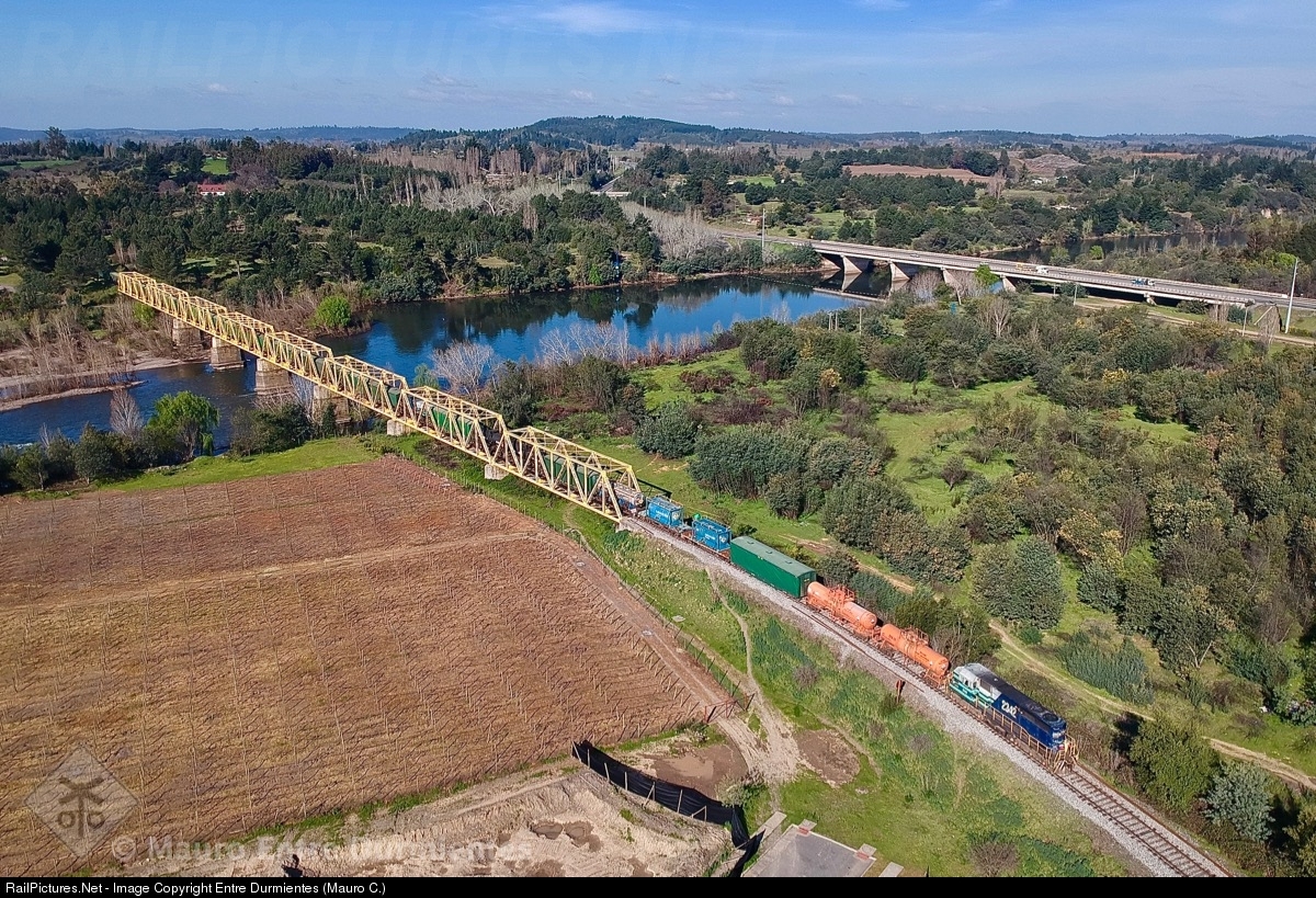 Railway bridge over the Itata river in the last section of the Rucapequen - Nueva Aldea branch line, is crossed by freight train 50.090 of FEPASA railroad with destination CELCO Nueva Aldea pulp mill facility in Nueva Aldea town, distant 1 mile from this location. The locomotive is a EMD SDL39, former Milwaukee Road, SOO line, and Wisconsin Central (lightweight and experimental version of the SD39, but uses a GP38's body and frame with the SD39's engine), unit D-2342 now working in Chile.