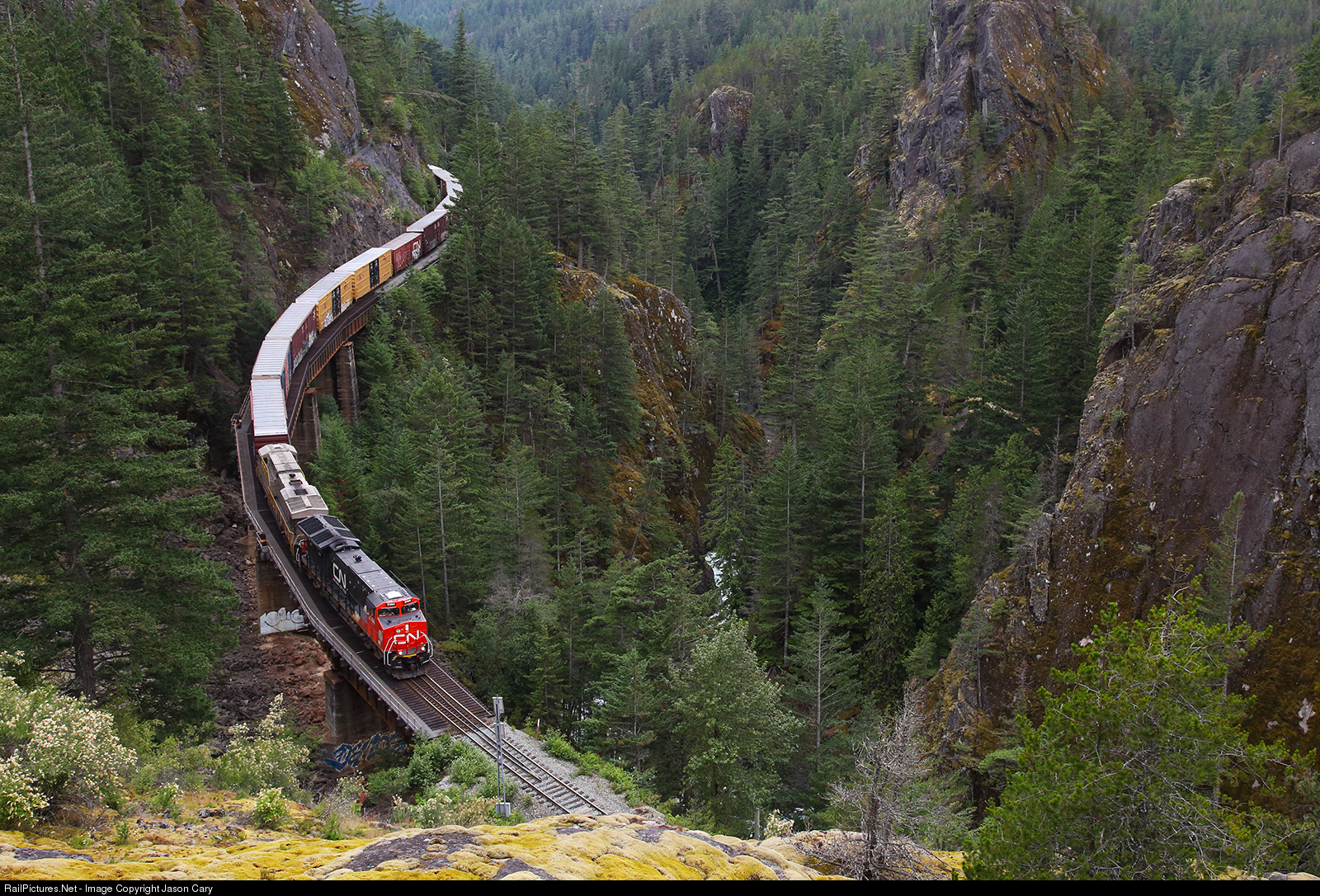The Pacific Great Eastern Railway built along the banks of the Cheakamus River towards Whistler in 1912. The railroad was extremely expensive to build and by 1918 the Railroad was bankrupt, with government taking over the property in 1918. Today the Canadian National uses the route to reach mills and mines in the remote interior of British Columbia. The ex PGE ex BC Rail route is a direct route to the seaport at North Vancouver. Todays train is led by the most modern locomotive on CN's roster, followed by empty boxcars used for Pulpwood loading.