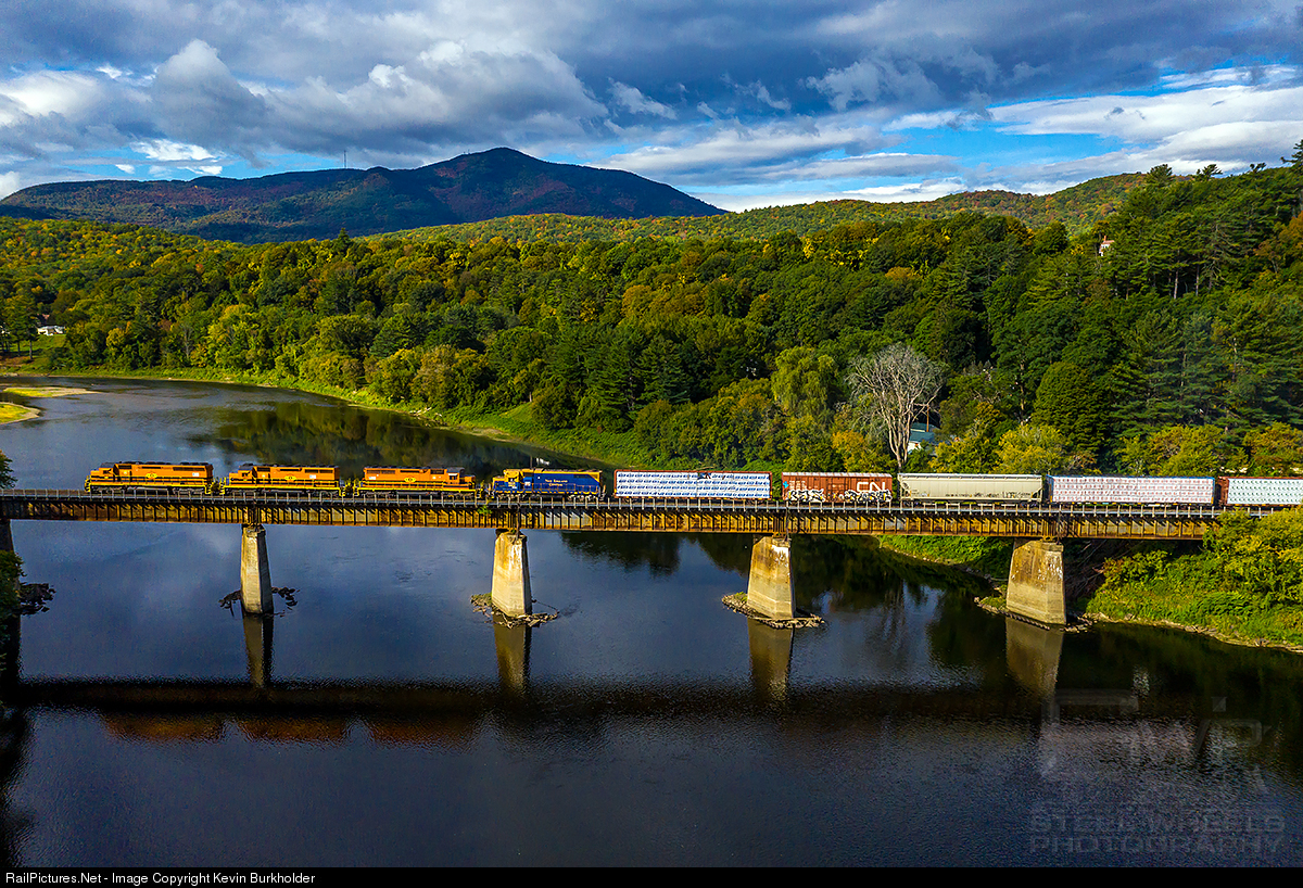 A late-running New England Central Railroad train 324 is seen with the Brattleboro turn crew #611 crossing the Connecticut River from Windsor, Vermont, to Cornish, New Hampshire, with NECR 324/611 is seen with SD40M-2s 3474, 3477, SD40-2R 3405 and GP38 3844.