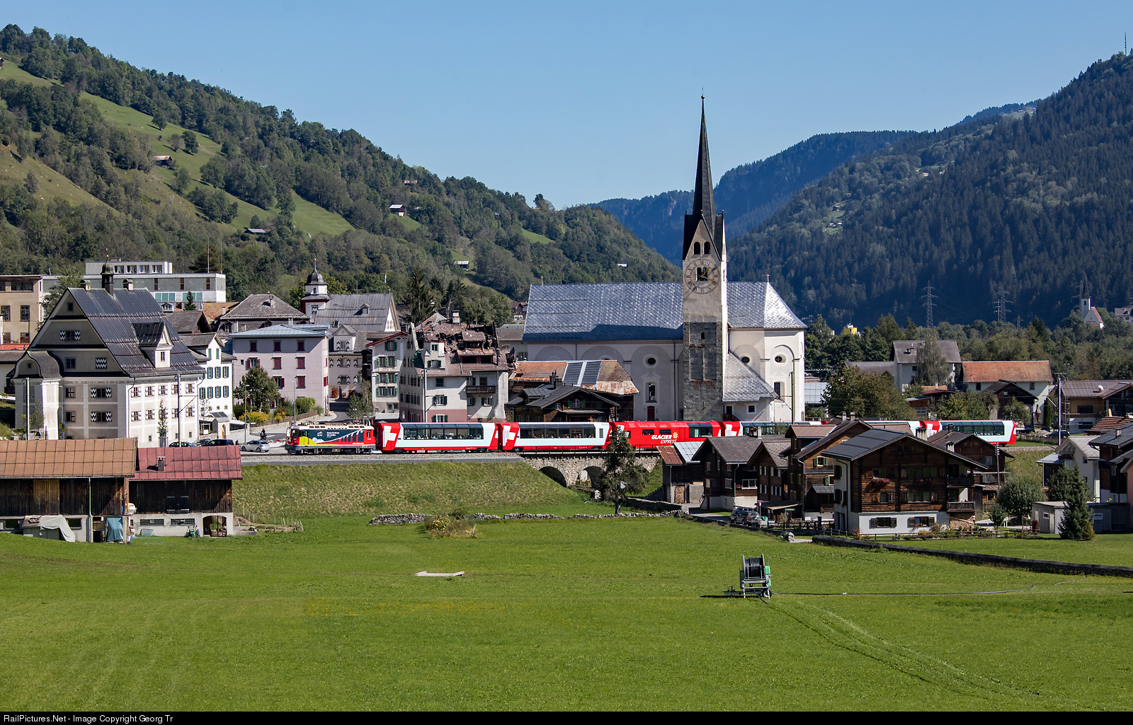 | Ge 4/4 II # 620 in the "RhB Club" paint scheme is pulling the GLACIER EXPRESS PE 905 from St.Moritz to Zermatt via Chur-Andermatt-Brig, running through the village of Trun. |