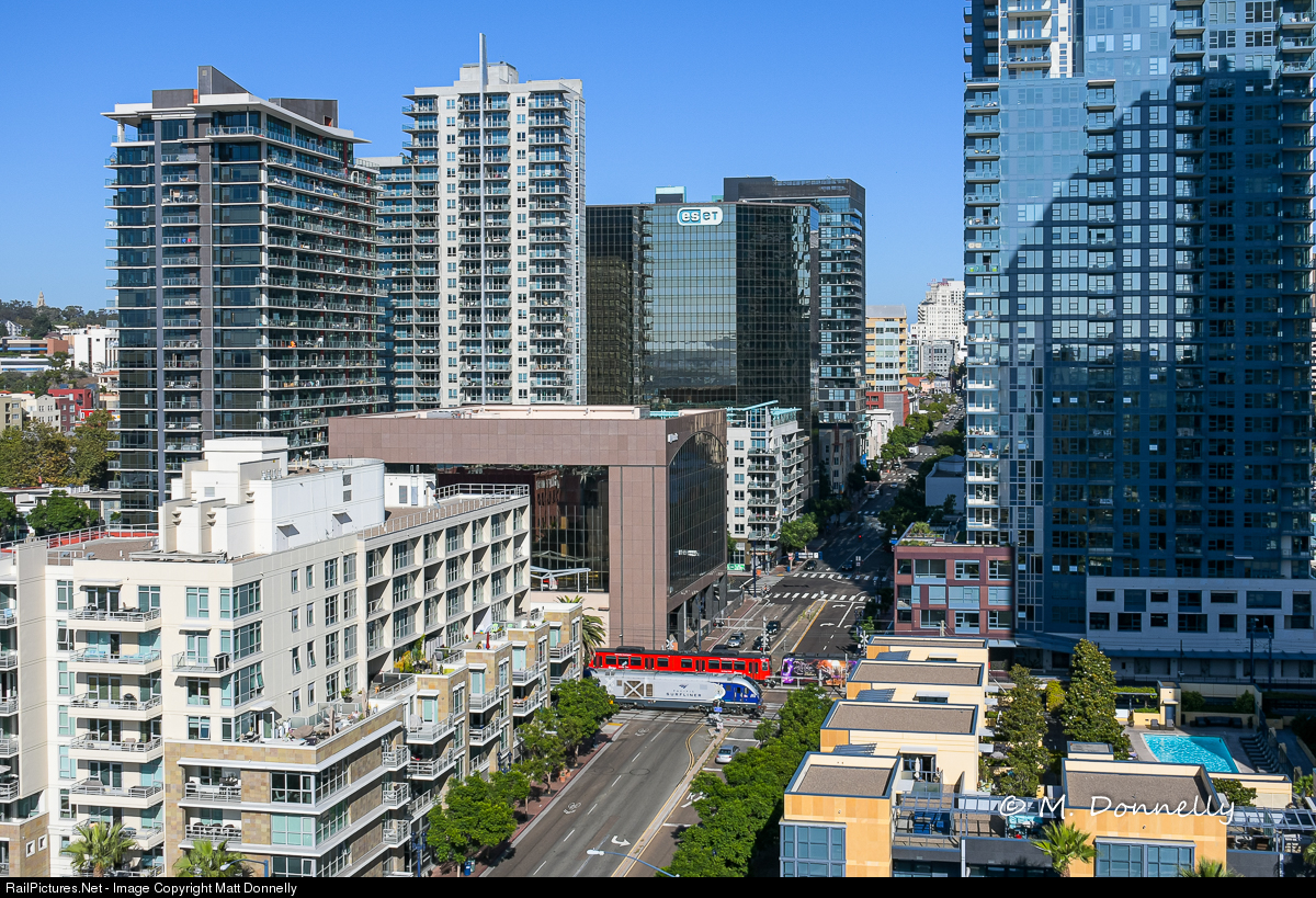 A Pacific Surfliner train rolls into downtown passing a lightrail train.