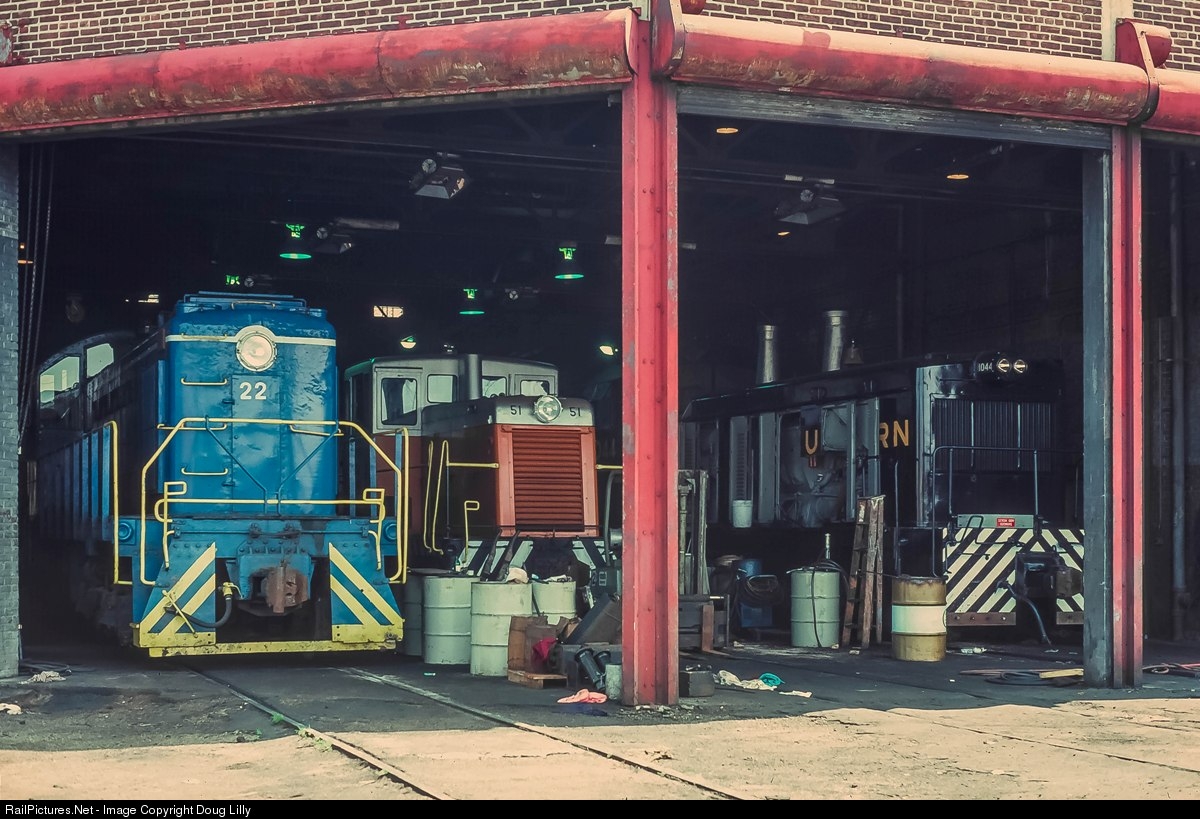 Power of the combined Brooklyn East District Terminal and New York Dock roster occupy the BEDT engine house. From left to right are BEDT S1 22, NYD GE 44-ton 51, and newly-acquired Southern NW2 1044. In two years the operation will be abandoned.