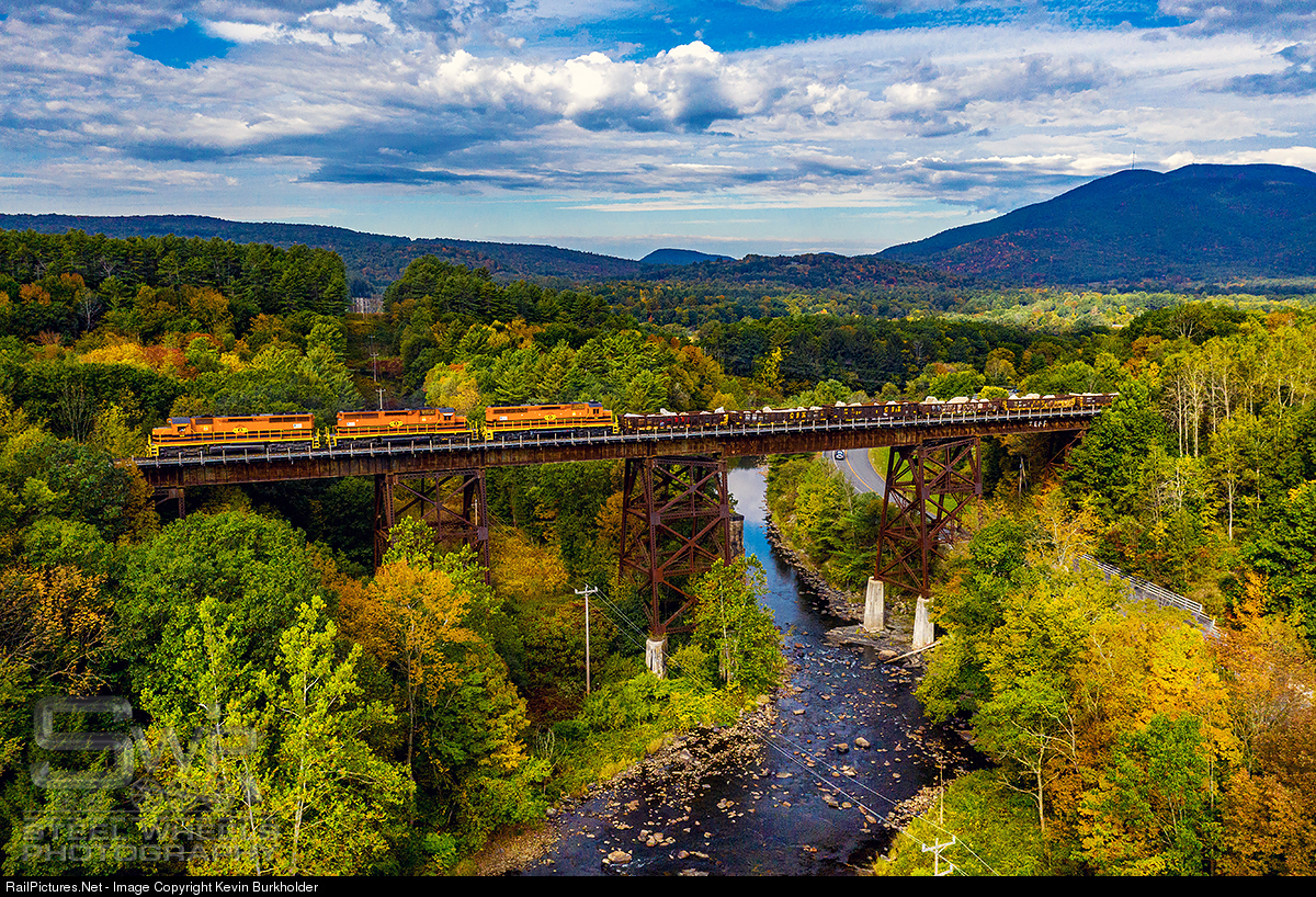 Another late-running New England Central Railroad train 324 heads south with an extremely well-timed patch of sun that was moving east toward the camera as the train headed south with SD40M-2s 3474, 3405, and 3475. Foliage is getting brilliant and following cold rain tonight may be intense by the weekend.