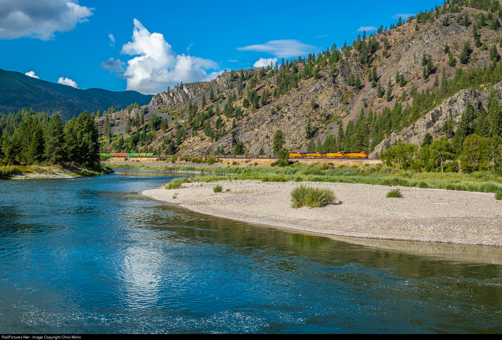 Westbound along the Clark fork River a quartet of BNSF engines with a string of hoppers breaks the silence on a beautiful Montana Morning