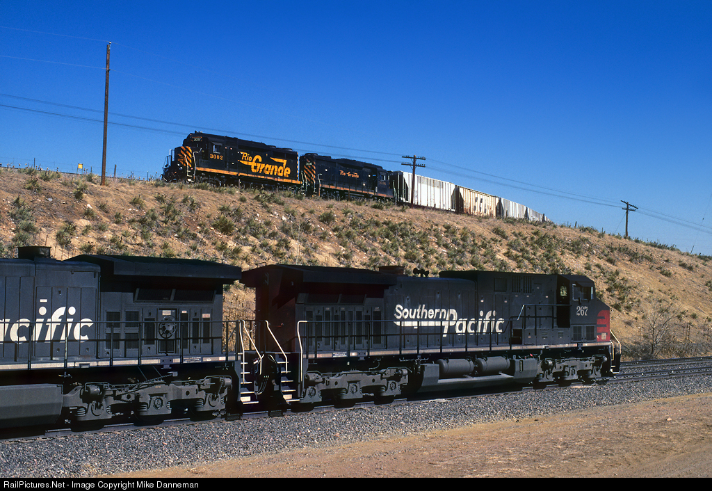 The West Local powered by Rio Grande GP30 Nos. 3002 and 3006 travels Rocky Spur above an eastbound coal train led by Southern Pacific GE AC4400CW No. 267, that is tied down in Rocky siding, on February 19, 1998. Only four of Rio Grande’s 28 GP30s ever received large billboard lettering on the long hood during repaints.