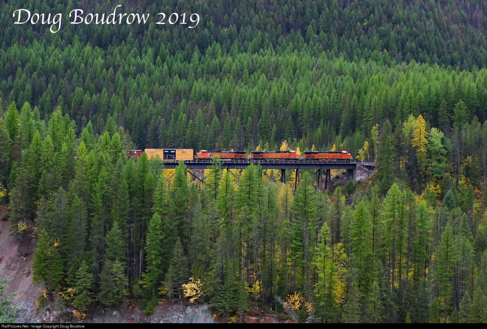 | A Westbound manifest freight crosses Sheep Creek Trestle, passing through the South tip of Glacier National Park. The bridge is referred to as Sheep Lick Trestle by the railroad, but often called Goat Lick Trestle by railfans and visitors. The area below is known for a spot that mountain goats frequent during the springtime to lick the natural salt off the rocks. |