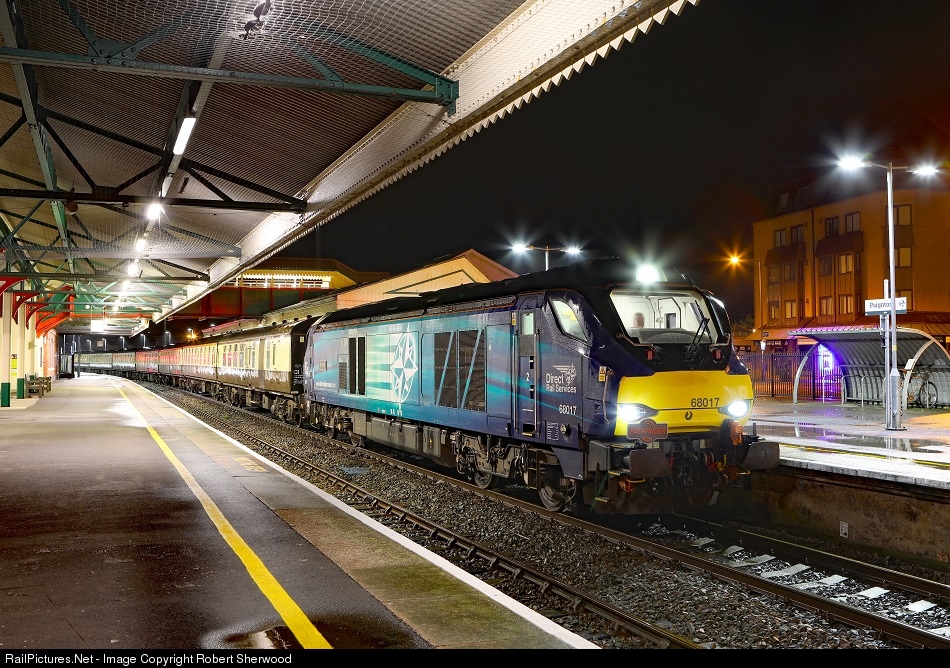 | 68017 stands at Paignton shortly before departure hauling Pathfinder Tours 1Z57 04:23 Paignton to Carlisle 'Autumn Highlander' charter on Friday 27th September 2019 |