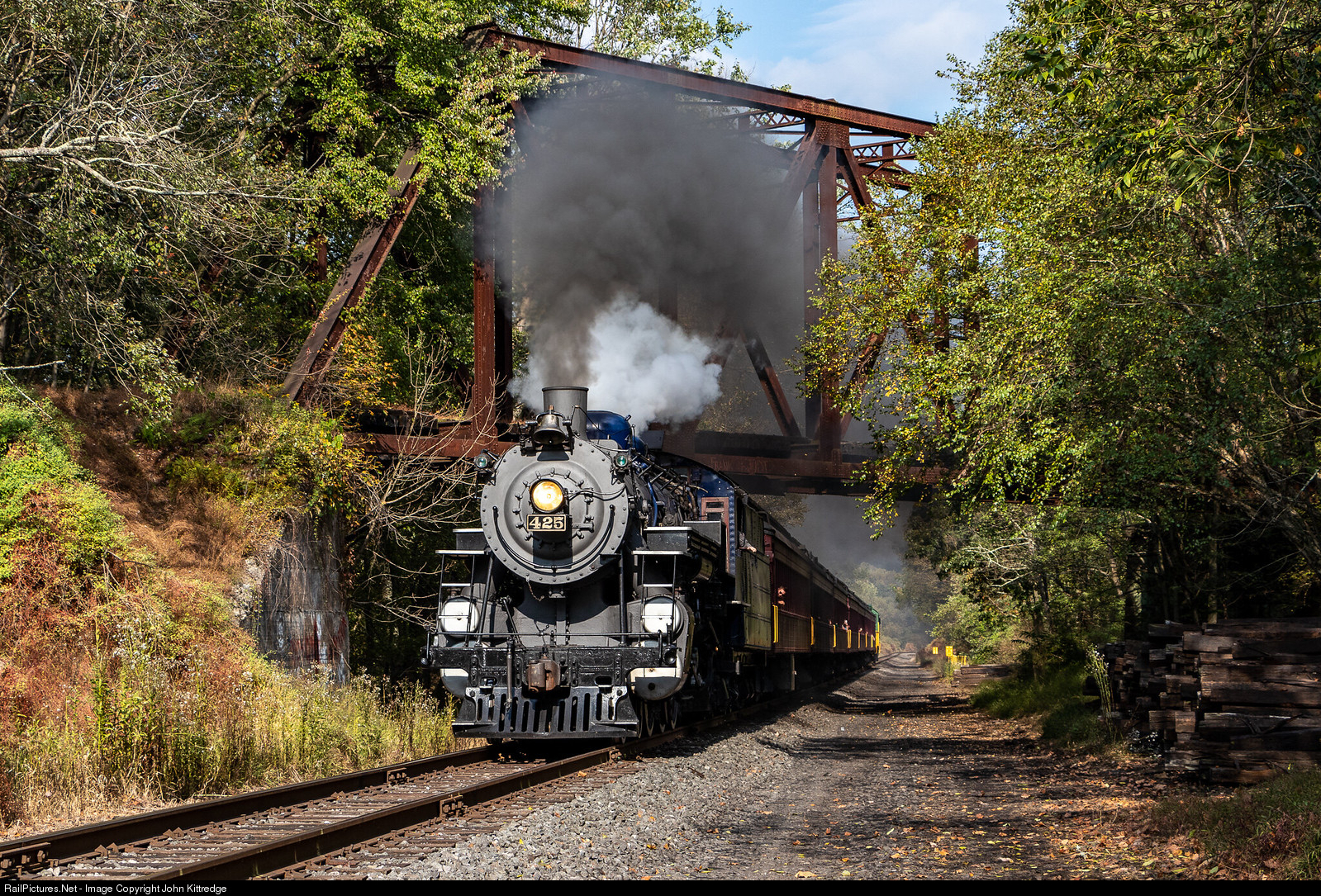 | Reading and Northern 4-6-2 charges into the afternoon sun with the 3pm edition of the Schuykill Haven Boro Days excursion as it passed under the former PRR bridge near Auburn, PA |