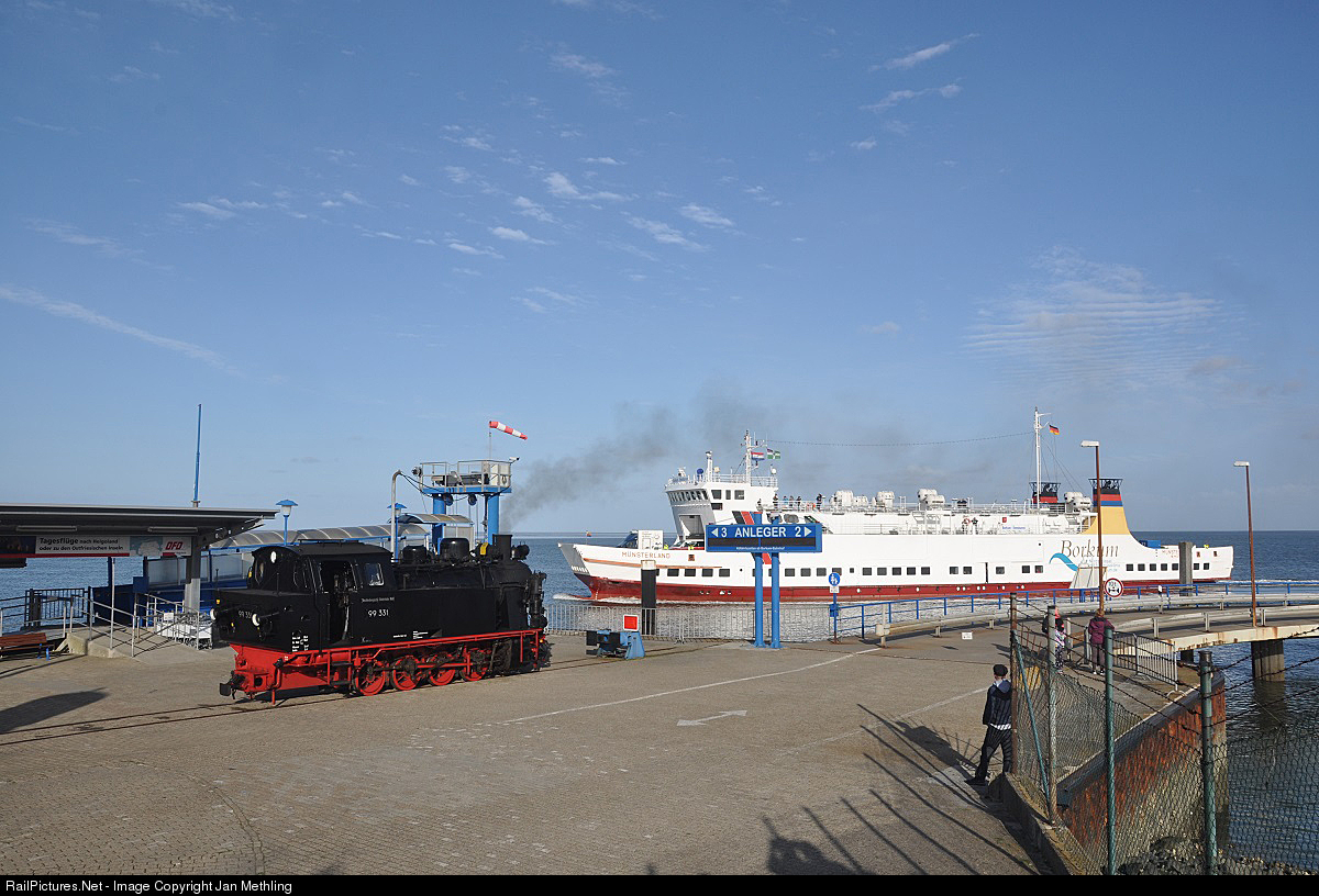 Molli's loco 99 331 has a special event and was used on the other 900 mm-NG-line in germany - on the isle of Borkum for regular trains for 10 days. Here the loco is in the harbour-area and wait for the return-train for the guests from the just arriving ferry. |