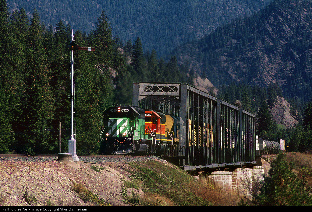 On the afternoon of September 12, 1998, an eastbound Burlington Northern Santa Fe train crosses the Clark Fork and passes the mile 210.3 semaphore east of Quinns, Montana, on Montana Rail Link’s Fourth Subdivision.