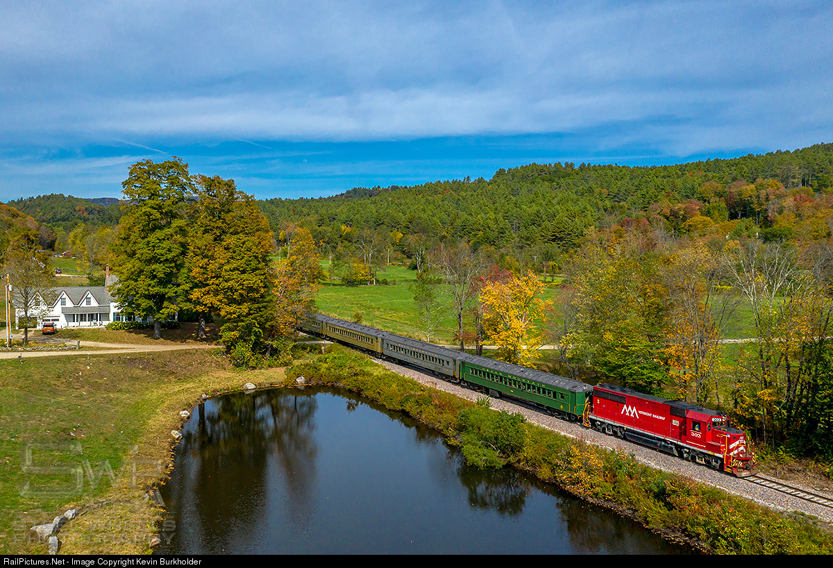 | Vermont Railway GP40-2 #303 leads the afternoon Foliage Express train from the Green Mountains back to Chester for Vermont Rail System's Green Mountain Railroad Passenger Services. Foliage has turned rapidly during the past week and much of the mountain side has gone from yellow and orange to a lot of brown, while lower level foliage is just seemingly getting into gear. |