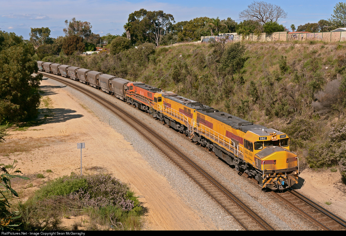| CBH Group's DBZ class locos are seen working a loaded grain train from MGC Forrestfield to CBH Kwinana. Led by DBZ2301, DBZ2305 & DBZ2302, 4K04 crawls through Cockburn where it will stop for safeworking before proceeding on to Kwinana. |