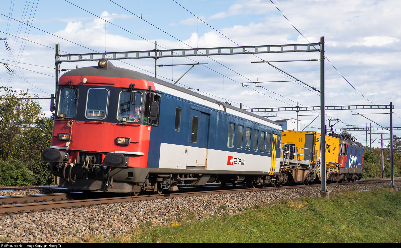 | "Sperry" ultrasonic track measuring push-pull train with leading cab car BDt 50 85 82-33 925-7, double container car Sggnss with Sperry SGS 206 container and shoving Re 421 # 389, running from Winterthur to Zürich near Winterthur Tössmühle. |