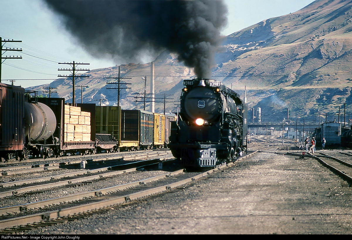 With a Rio Grande freight passing on the left, and railfans on the right taking photos and quickly heading back to their cars, Union Pacific 3985 puts on a show as it slowly heads south to the Union Station. UP 3985 took a passenger train special down to Provo and back, and because it was a coal burner, it set off many brush fires. This led to UP 3985 being converted from a coal to oil burner. This was the very first time I saw an articulated steam locomotive running, and what a sight it was!