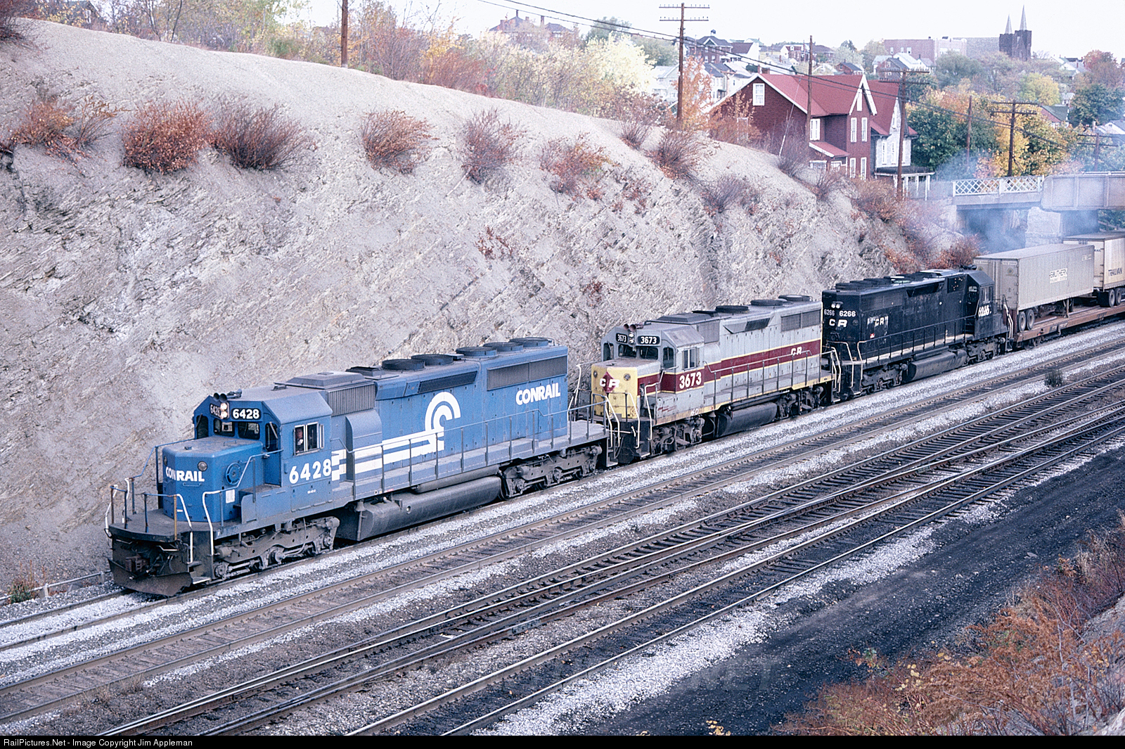 CR 6428, CR 3673 GP35 (ex-EL 2567), & CR 6266 SD40 (retaining its PC 6266 number) lead this westbound trailer-van train up the grade at Slope. The old overpass at 241/2 Street was still in service.