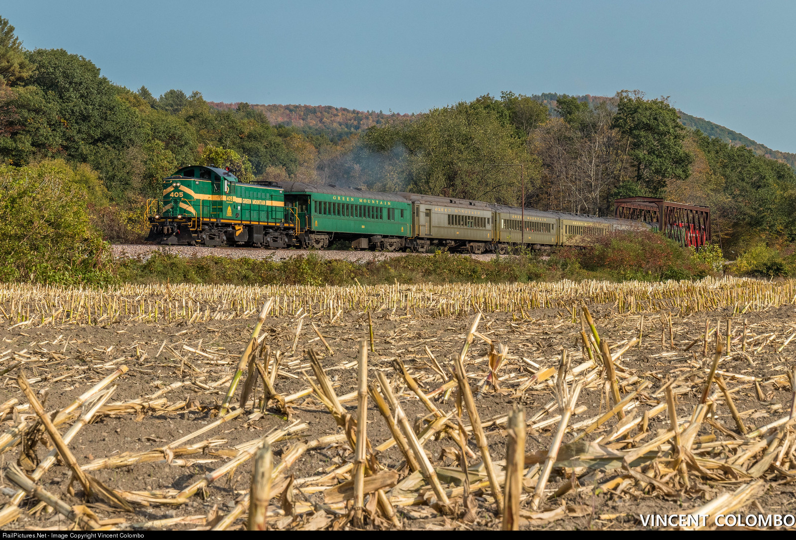 | Green Mountain Railroad 405 (ex-RUT RS-1) leads the last Fall Foliage Train of the day by a freshly-harvested corn field by Missing Link Road in Chester, VT. |