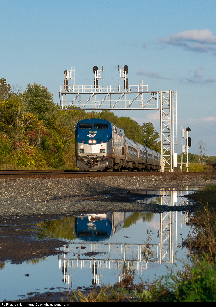 | The evening Amtrak "Empire Service" passes through CP 382 just after a rainstorm passed through the area, allowing for a nice reflection of the train and 382 signal bridge. |