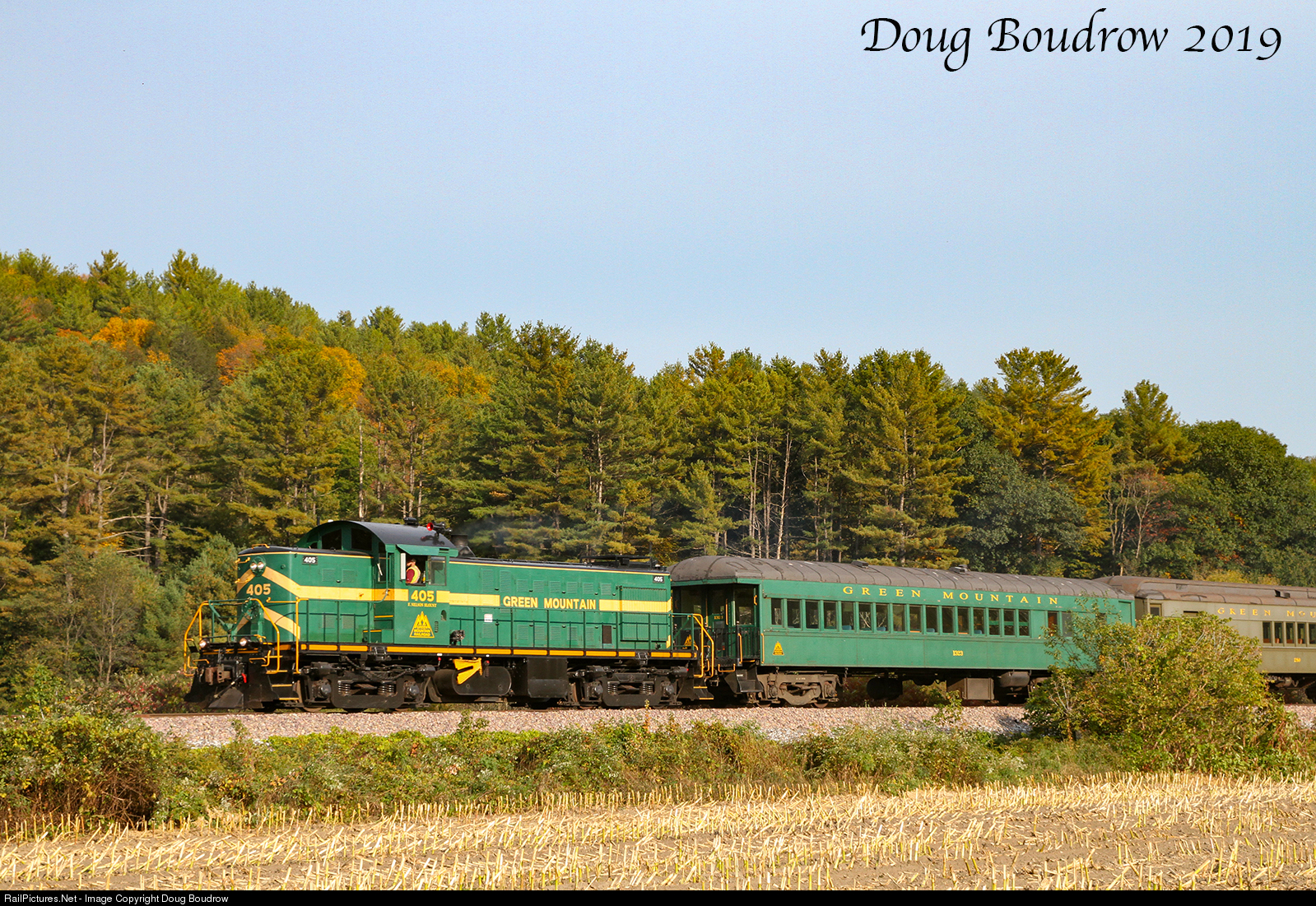 | On the final run of the day, Green Mountain Rail Company 405, a 1951 ALCO RS-1 originally built for the Rutland Railroad leads a train North out of Rockingham headed back to Chester. The 405 has been running the rails in Vermont since it was built and is the only one of its class remaining active in the state.